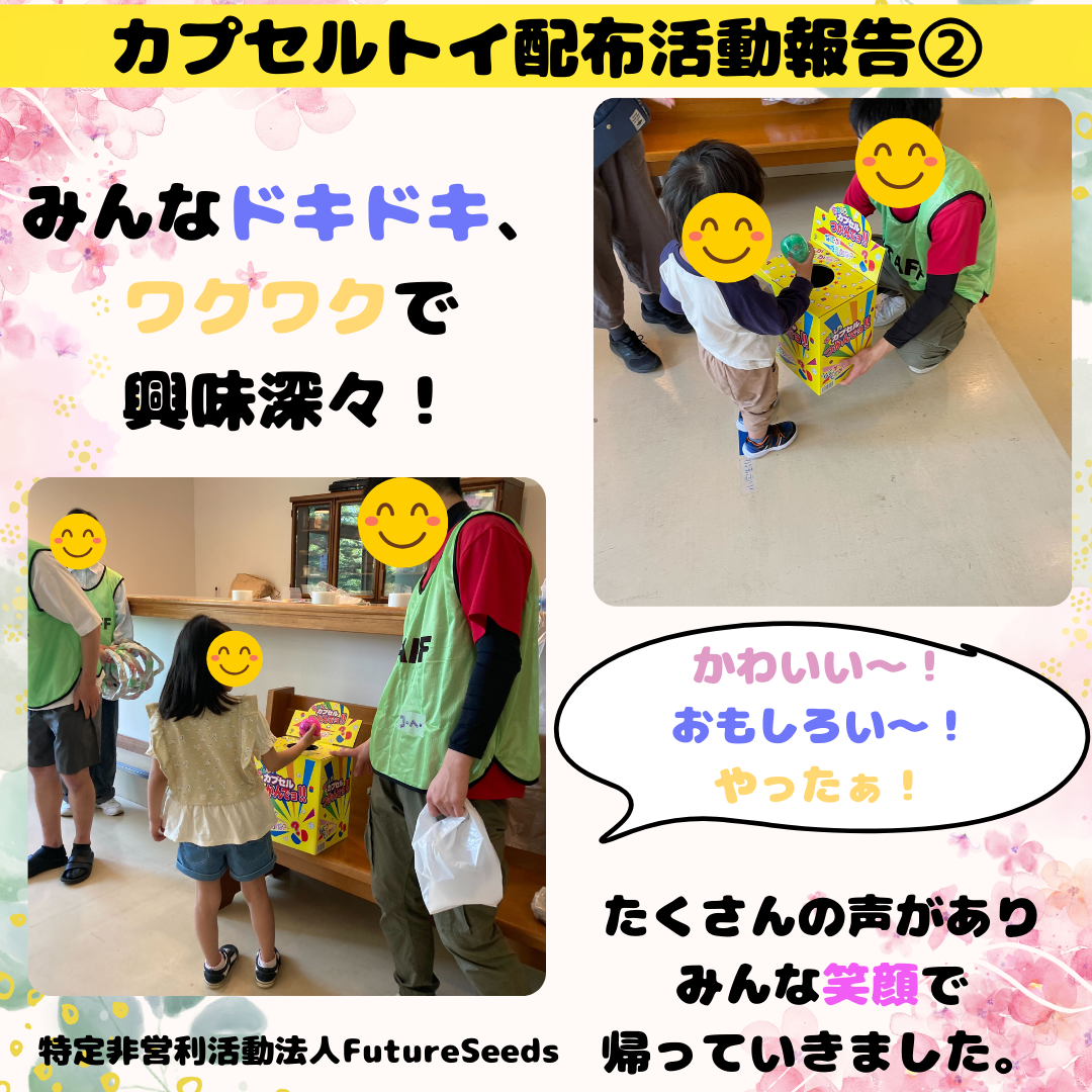 このたび、岩手県滝沢市NPO法人FutureSeeds様から、イベントで子どもたちにカプセルトイをプレゼントしましたとのお礼と写真が届きました。