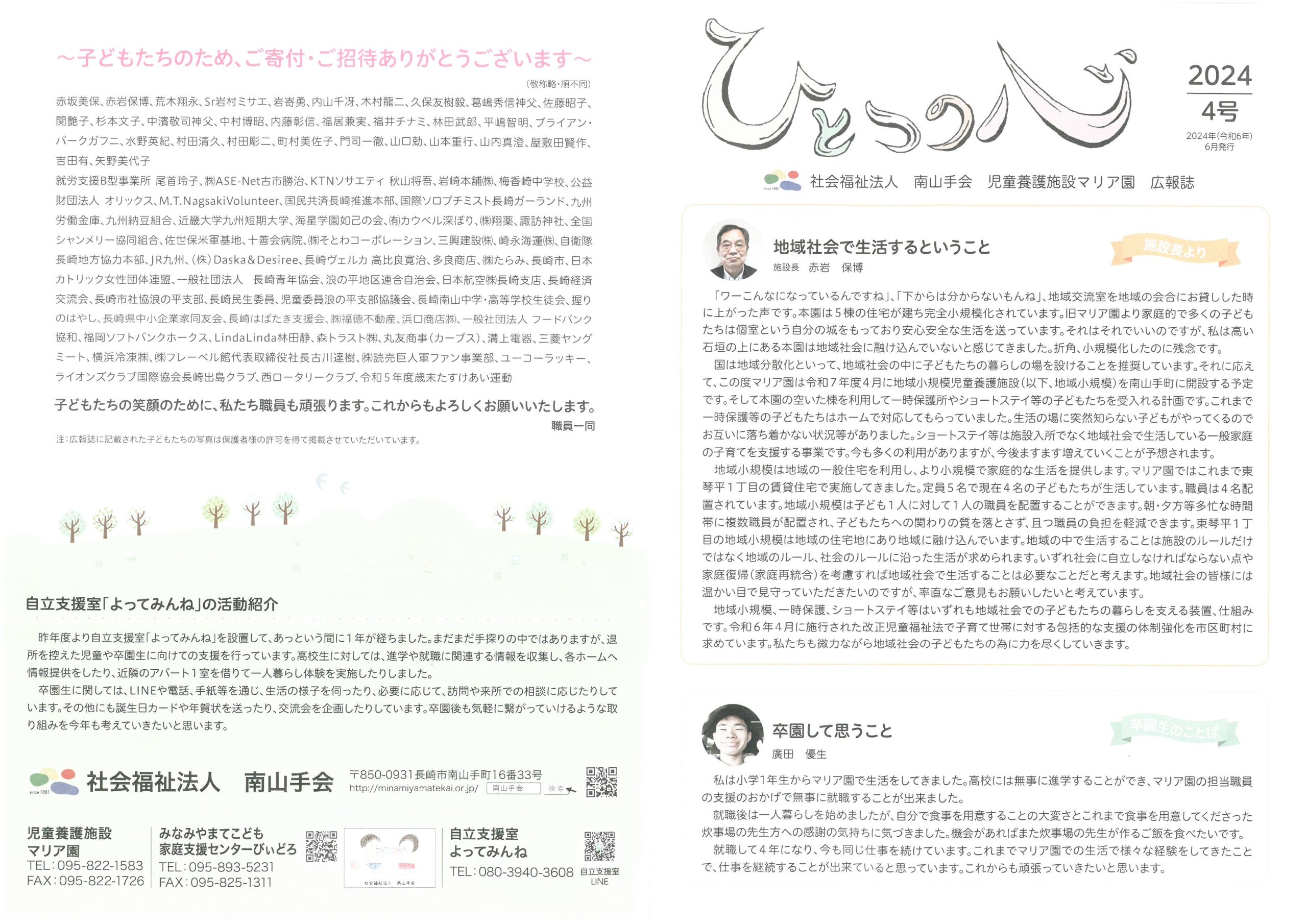 このたび、長崎市の社会福祉法人南山手会 児童養護施設 マリア園様から、広報誌「ひとつの心」4号が届きました。