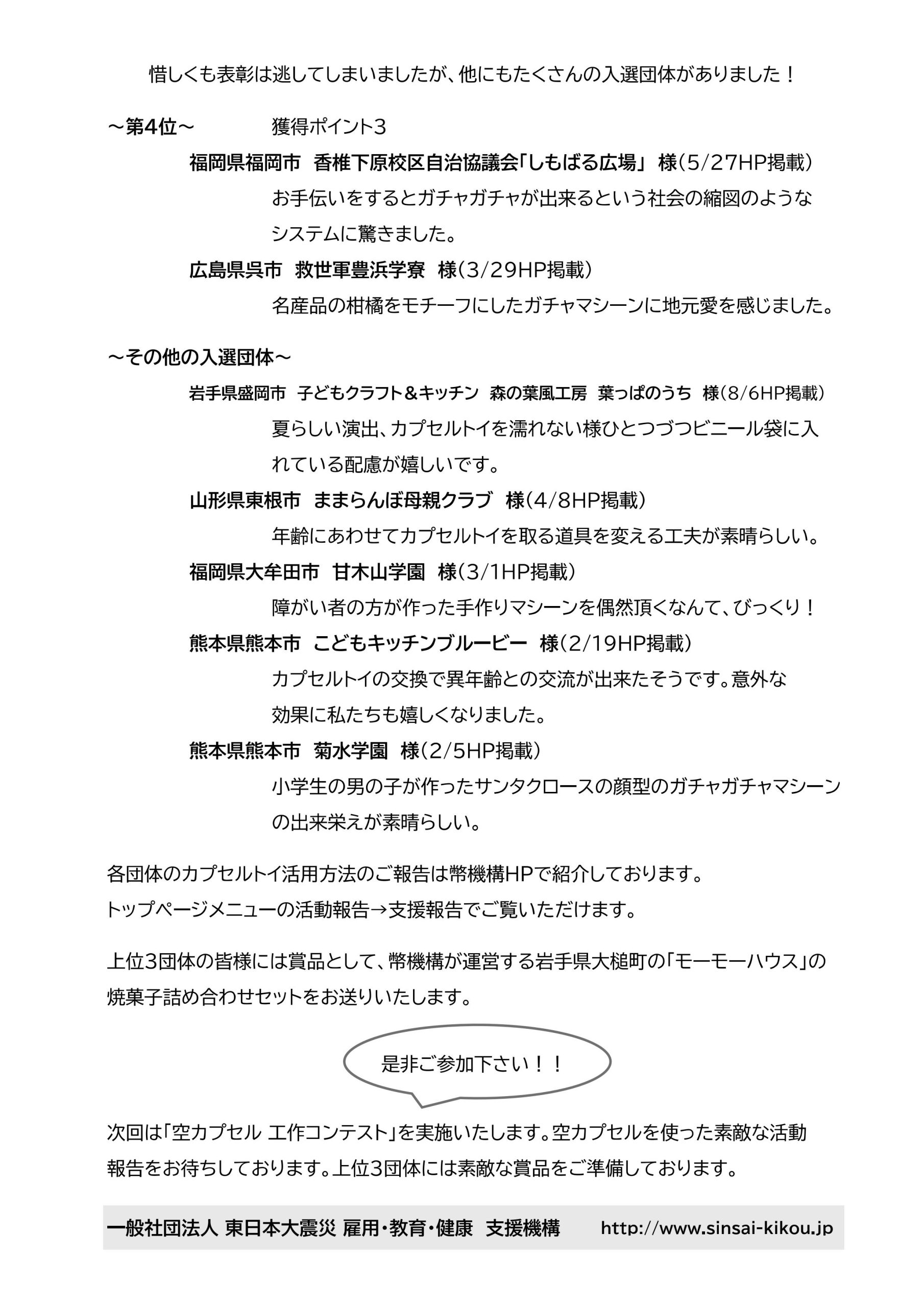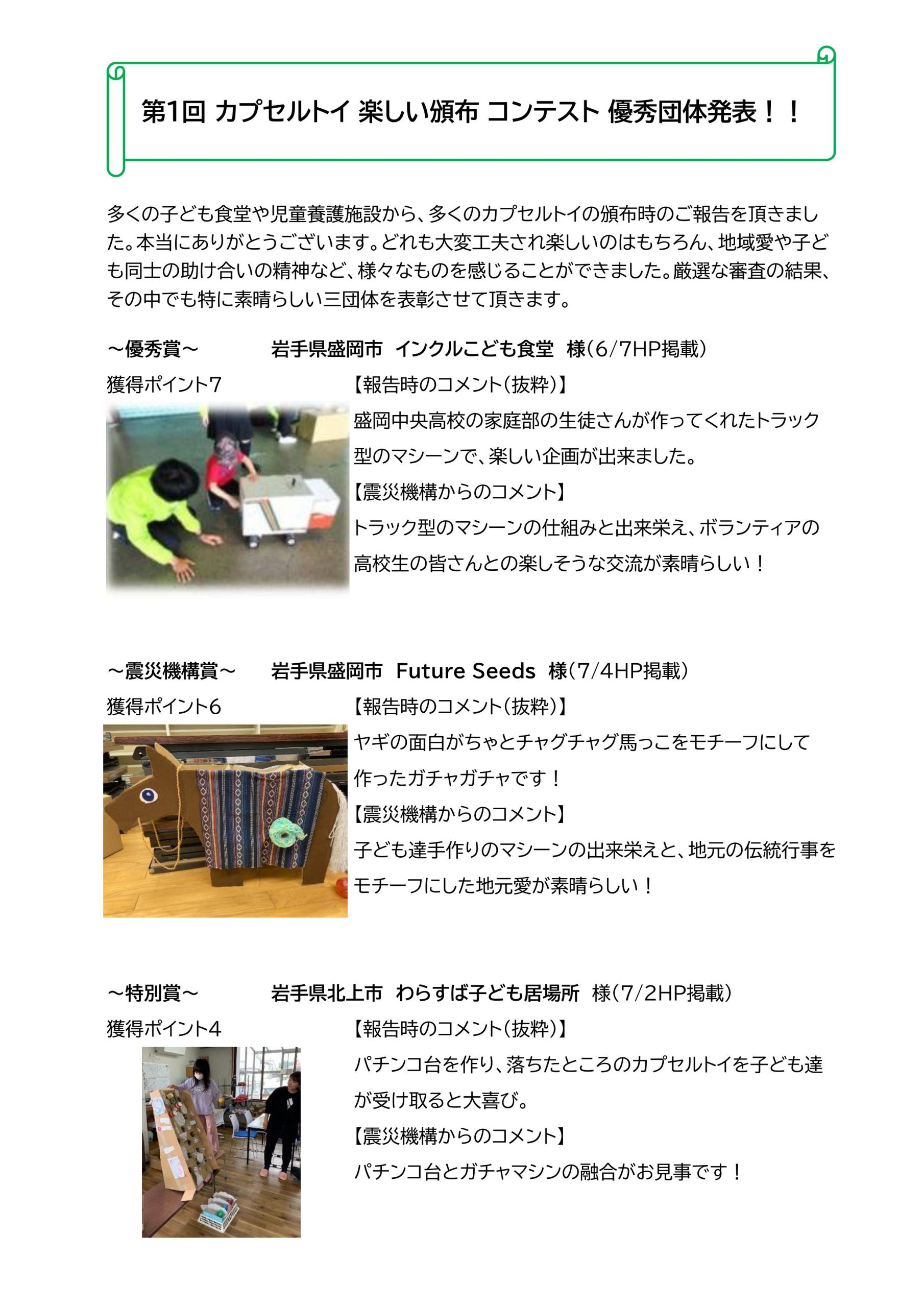 2024年8月26日 震災機構は、手作りガチャガチャマシンのコンテスト(第1回カプセルトイ 楽しい頒布コンテスト)を実施しました。 令和6年1月から7月までに応募された多数の作品を厳正に審査の結果、優秀団体が決定しましたのでお知らせします。入賞作品の詳細は、団体名の横の掲載日のHPをご覧ください。 沢山のご応募ありがとうございました。 FacebookXCopy
