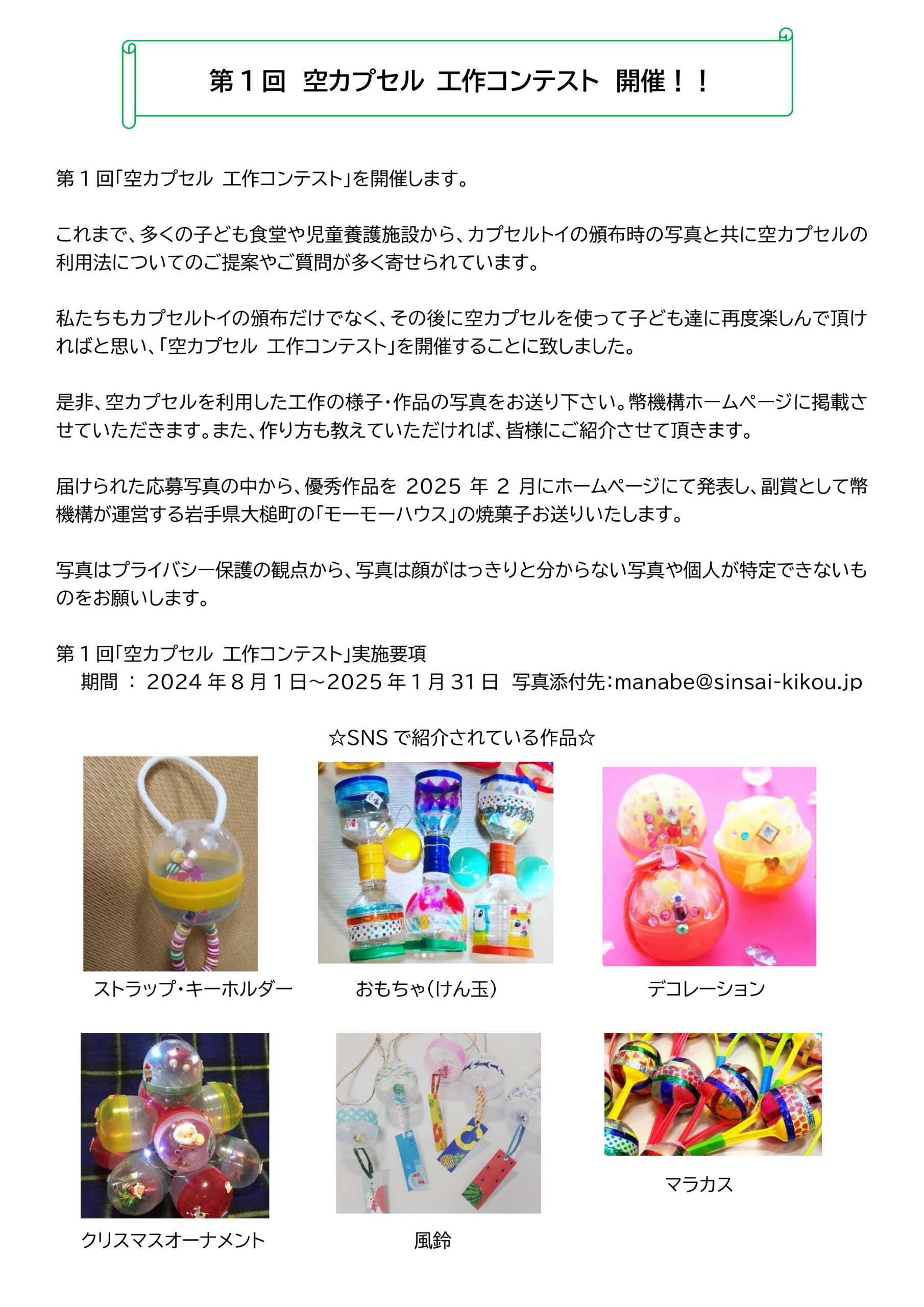 2024年8月27日 「第1回カプセルトイ楽しい頒布コンテスト」(手作りガチャマシ-ンコンテスト)に引き続きまして、「第1回空カプセル工作コンテスト」を開催いたします。空のカプセルを利用した素敵な活動報告をお待ちしております。 上位3団体には素敵な賞品を準備しております。 FacebookXCopy