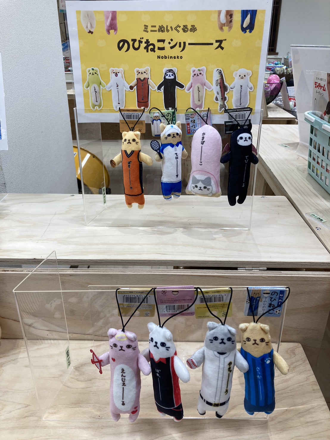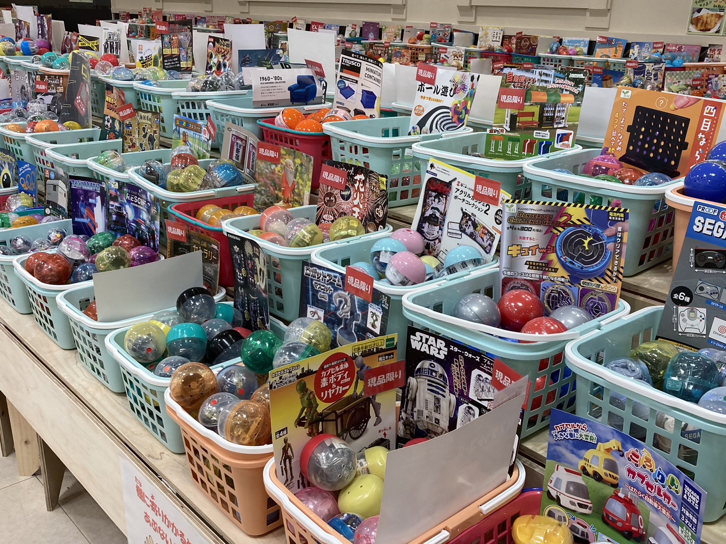 通常ガチャガチャは、専用の機械に硬貨を投入し、レバーを回すとカプセルが出て来るものですが、催事場には木製の棚のカプセルトイが籠に入れられ自分の欲しいものを手に取って選べるという画期的な形となっています。
