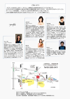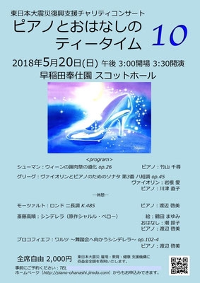 「ピアノとおはなしのティータイム10」東日本大震災復興支援チャリティコンサートが5月20日(日)に早稲田奉仕園スコットホールで開催されます。