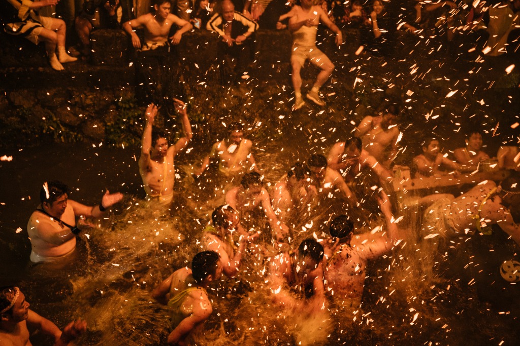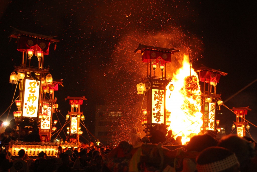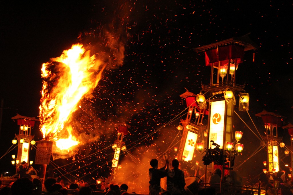 初日の夜、勢揃いしている大小合わせて約40本のキリコは太鼓や鉦を鳴らしながら、火がついた大松明の周りを火の粉を浴びながら暴れ回るように練り廻り、祭りは最高潮に達します。