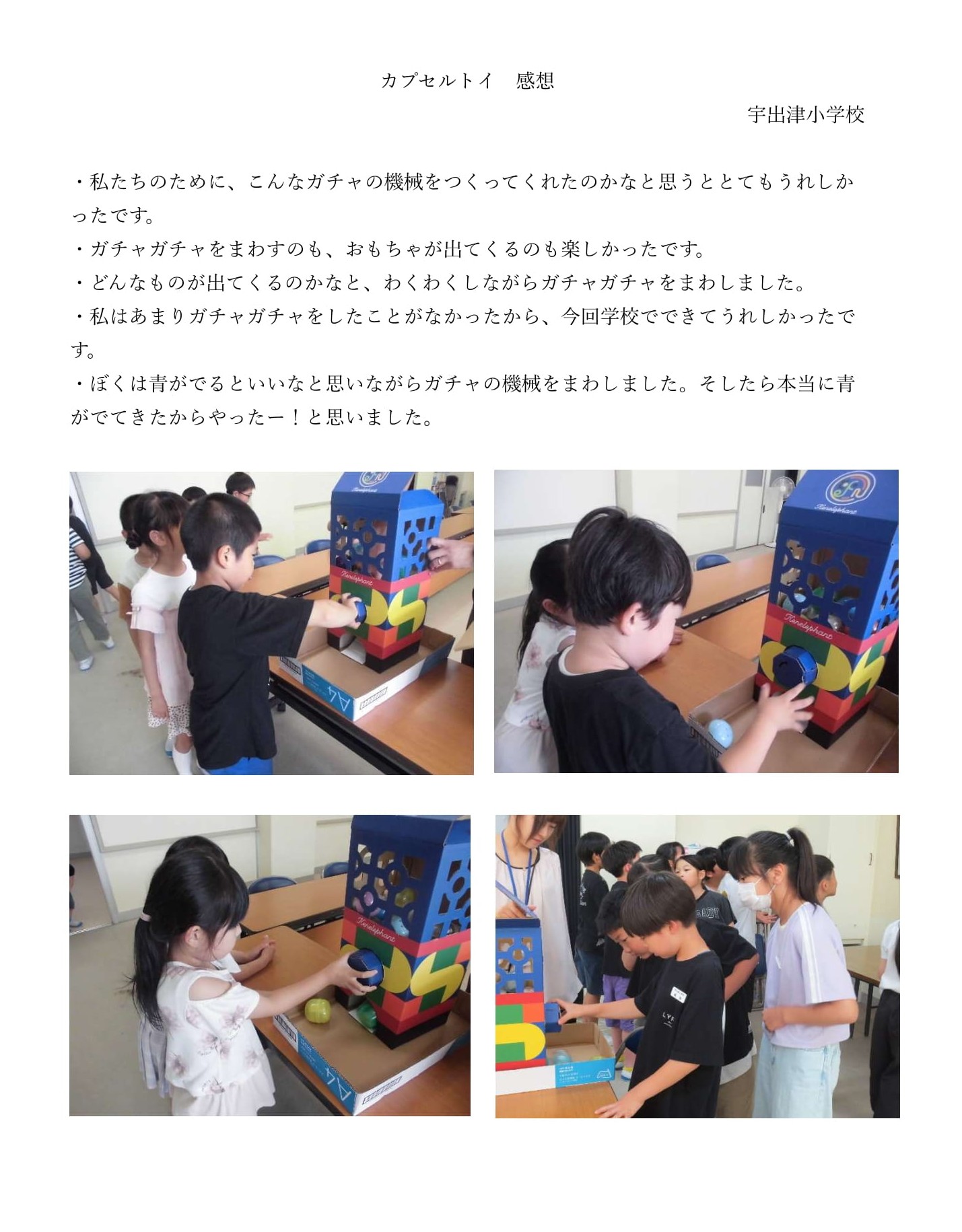このたび、石川県鳳珠郡能登町教育委員会様から能登町立宇出津(うしつ)小学校でのカプセルトイ配布時の写真と子どもたちの声が届きました。