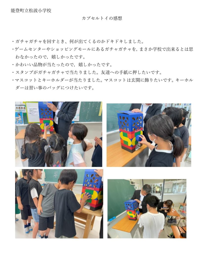 このたび、石川県鳳珠郡能登町教育委員会様から能登町立松波小学校でのカプセルトイ配布時の写真と子どもたちの声が届きました。
