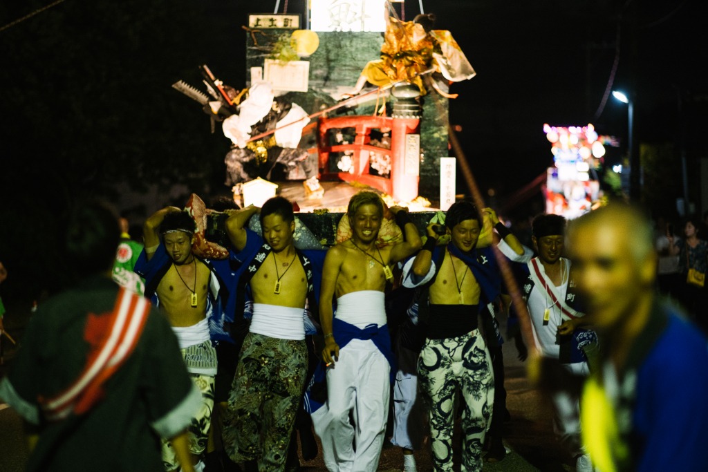 14時頃に内浦福祉センター前に9基のキリコが集結し、人形審査が行われます。夜になるとキリコは町内の大通り交差点に集結し、交差点で次々と乱舞を行います。