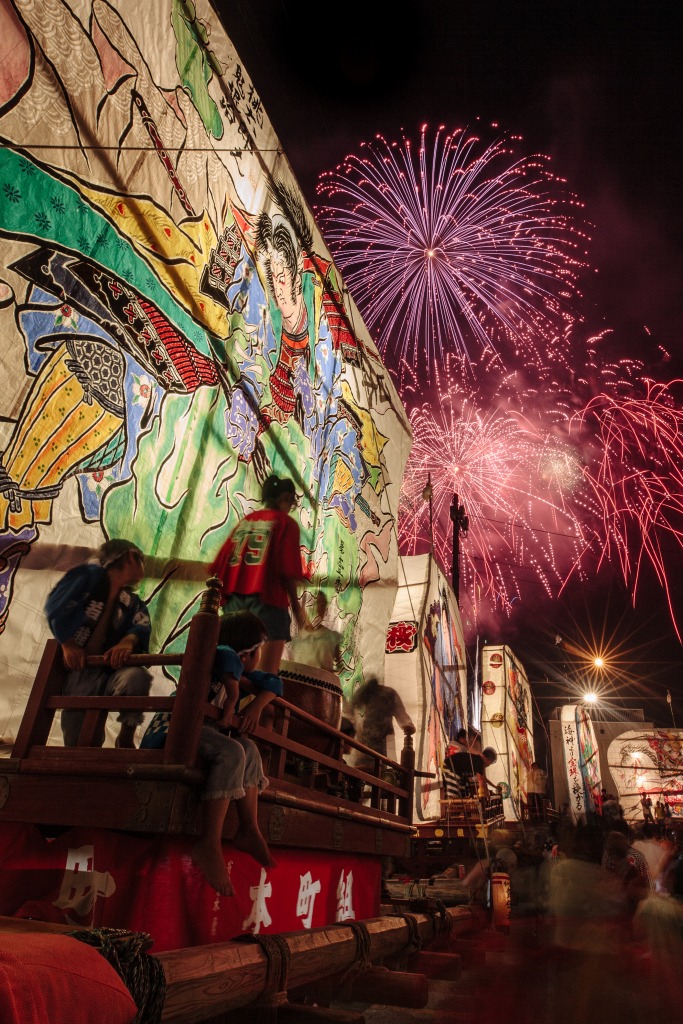 高さ7m、幅5.4mの「にわか」と呼ばれる大奉燈9基が、鵜川の街の中を駆け巡ります。