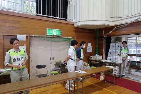 写真は避難所の伝言板と、避難所を運営する岡山県と倉敷市のスタッフです。