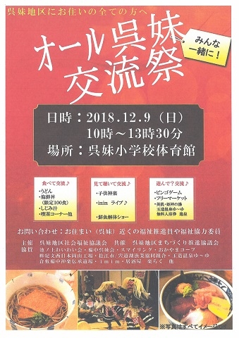 平成30年12月9日(日)岡山県倉敷市真備町の呉妹小学校にて「オール呉妹交流祭」が開催されました。