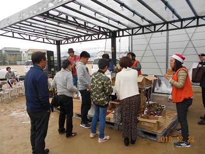 当日は、川辺小学校体育館横の「あるく」様の事務所前で、「あるく」様スタッフが、こがねもちの他、子供向けに、おもちゃ・文房具を、大人にはキウイ、菓子などを配っていました。会場にはバンド演奏もあり演奏を楽しむ方々も見受けられました。