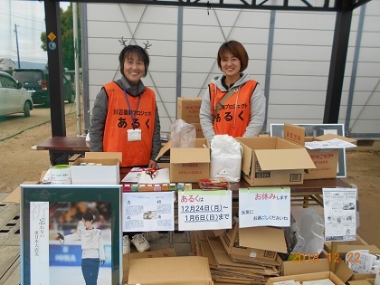 写真は川辺小学校体育館横にある「あるく」事務所前での配布の模様です。羽生結弦選手の復興支援ポスターも掲示されています。