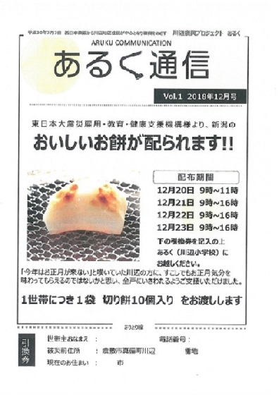 最初の写真は、川辺復興プロジェクト「あるく」様機関紙「あるく通信」に掲載された弊機構のこがねもち配布の案内です。