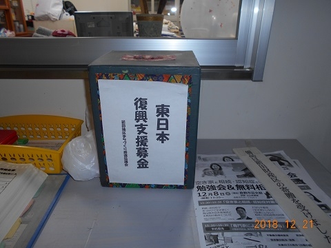 次の写真は事務所内に置かれた募金箱です。箭田地区まちづくり推進協議会様は東日本大震災発生後から、岩手県山田町の支援を続けられてきたそうです。