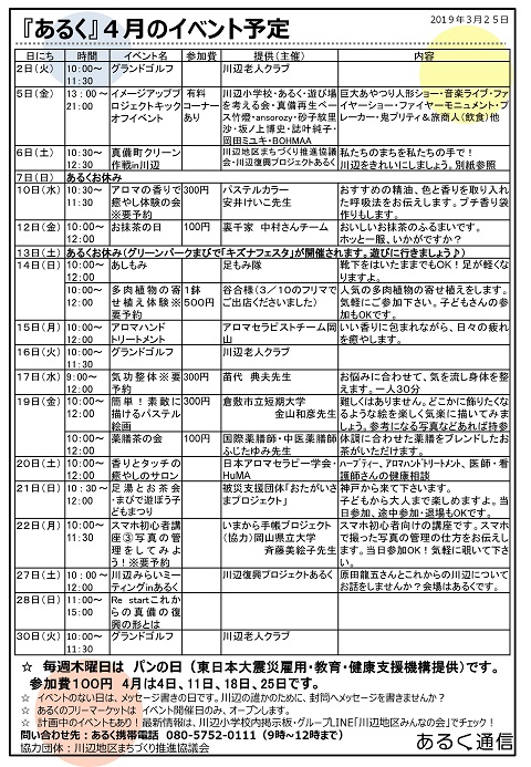 その中に、「毎週木曜日は、パンの日(東日本大震災雇用・教育・健康支援機構 提供)です。 参加費100円 4月は4日、11日、18日、15日です。」とあります。
