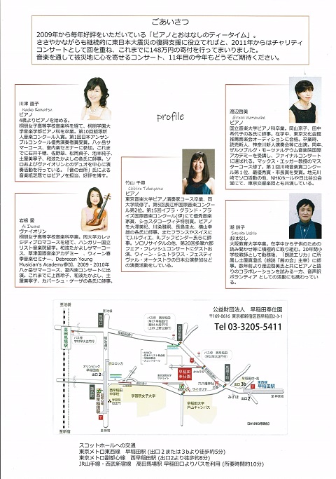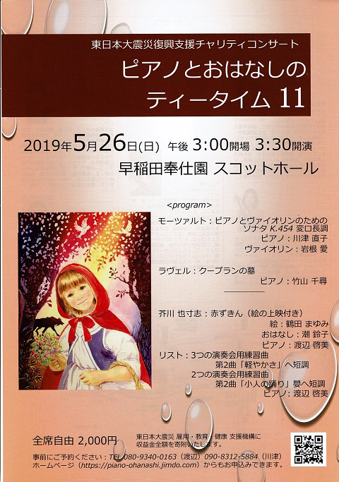 「ピアノとおはなしのティータイム11」東日本大震災復興支援チャリティコンサートが5月26日(日)に早稲田奉仕園スコットホールで開催されます。