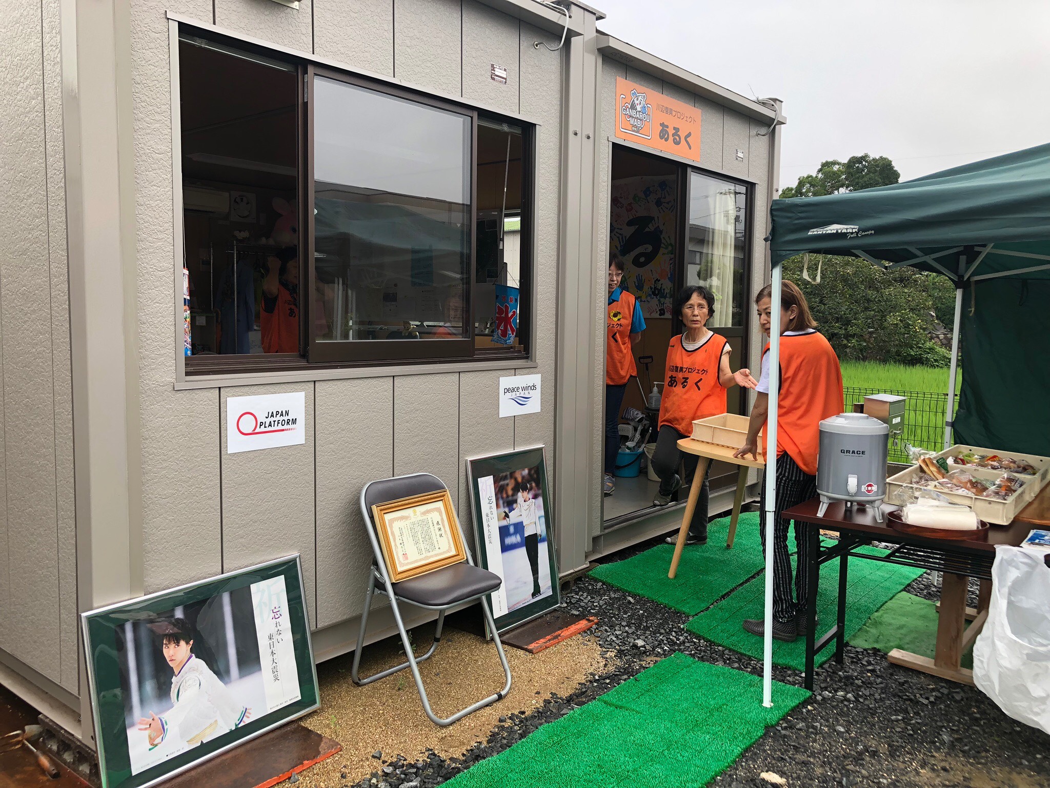 写真は、パン配布を準備中の「あるく様」の事務所前の風景です。 羽生選手の復興支援ポスターも見えます。