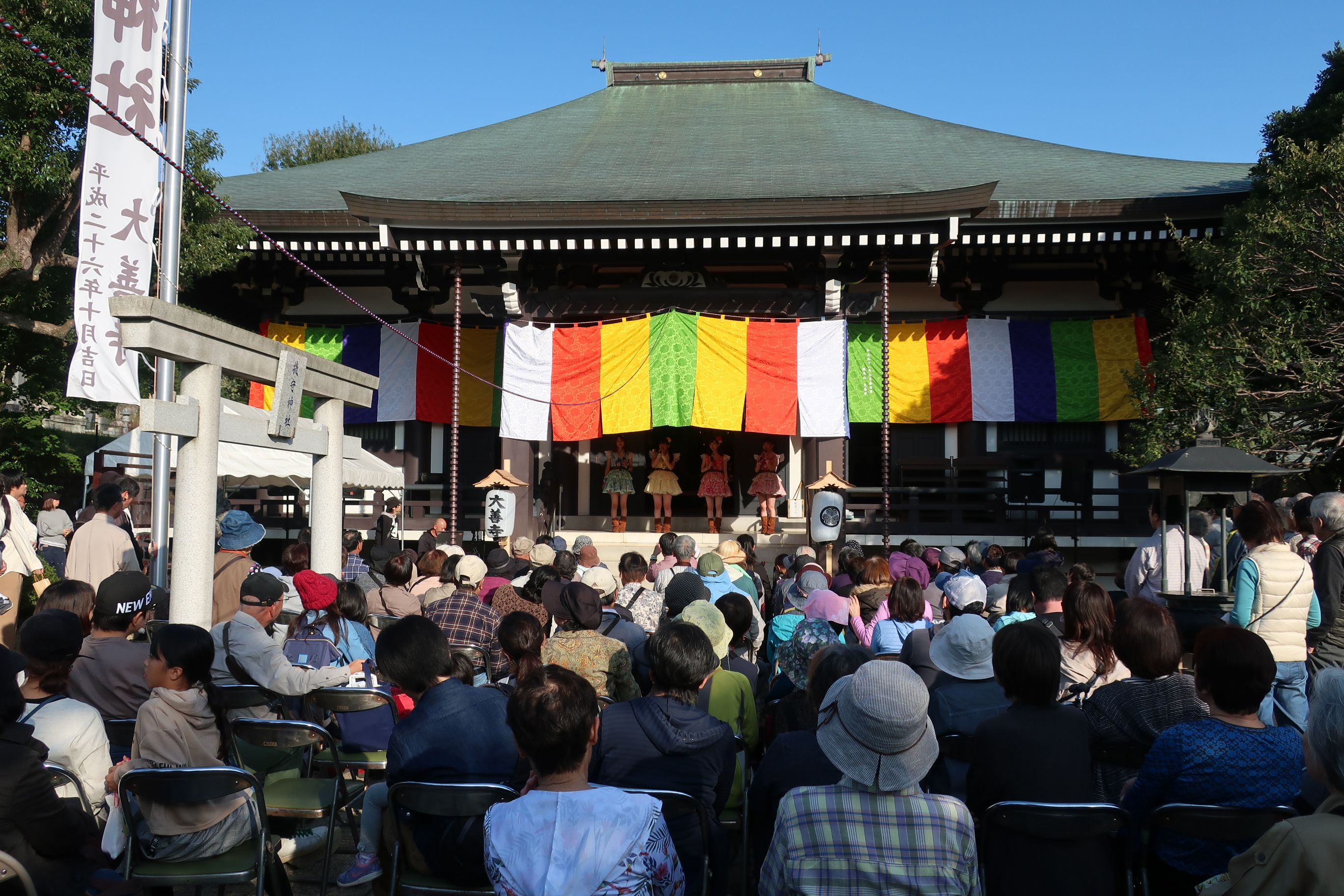 この日は朝から晴天に恵まれ、関東各地から大勢のご来場者があり大盛況でした。本堂ではエッセイストで初代林家三平夫人 海老名香葉子師の講演、本堂前では地元八王子のアイドルグループ「8プリンセス(はちぷり)」公演、こども広場ではゲームが行われ、事務所前の広場では柏のベーカリー ハレビノさんや、千葉房総の道の駅や花屋さんなどの店が並びました。