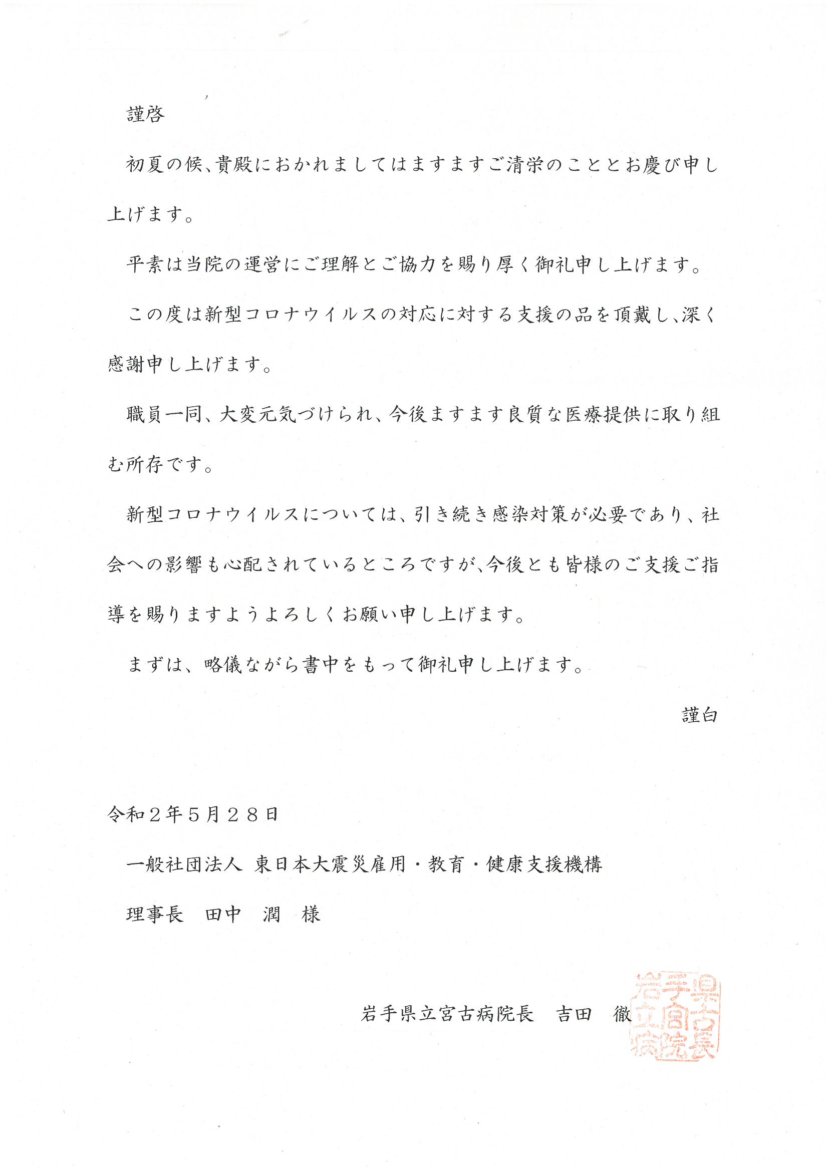 このたび同病院の吉田徹病院長様からお礼状が届きました。