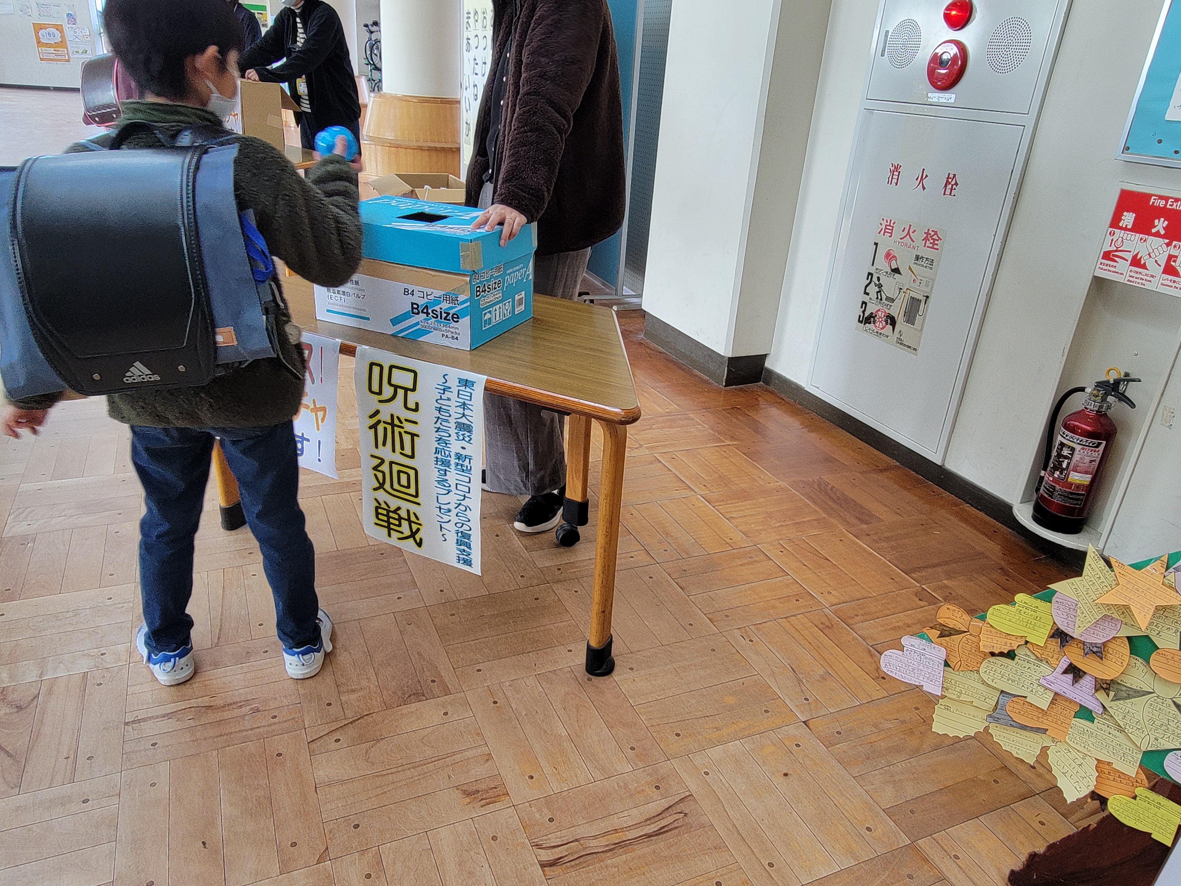 震災機構は、令和3年10月より、コロナ禍で学校行事が思うように出来ず、困っている被災した東北3県の小学校に、学校でのイベントなど楽しい場づくりに活用してもらうことを目的に、いわゆるガチャガチャで販売されている「鬼滅の刃」や「呪術廻線」など、今、子どもたちに最も人気のあるキャラクターグッズの無償頒布を行っています。このたび宮城県の宮城郡利府町立青山小学校様から捨身が届きました。「子供たちのため、すばらしいプレゼントを贈っていただきこころより感謝いたします」とありました。