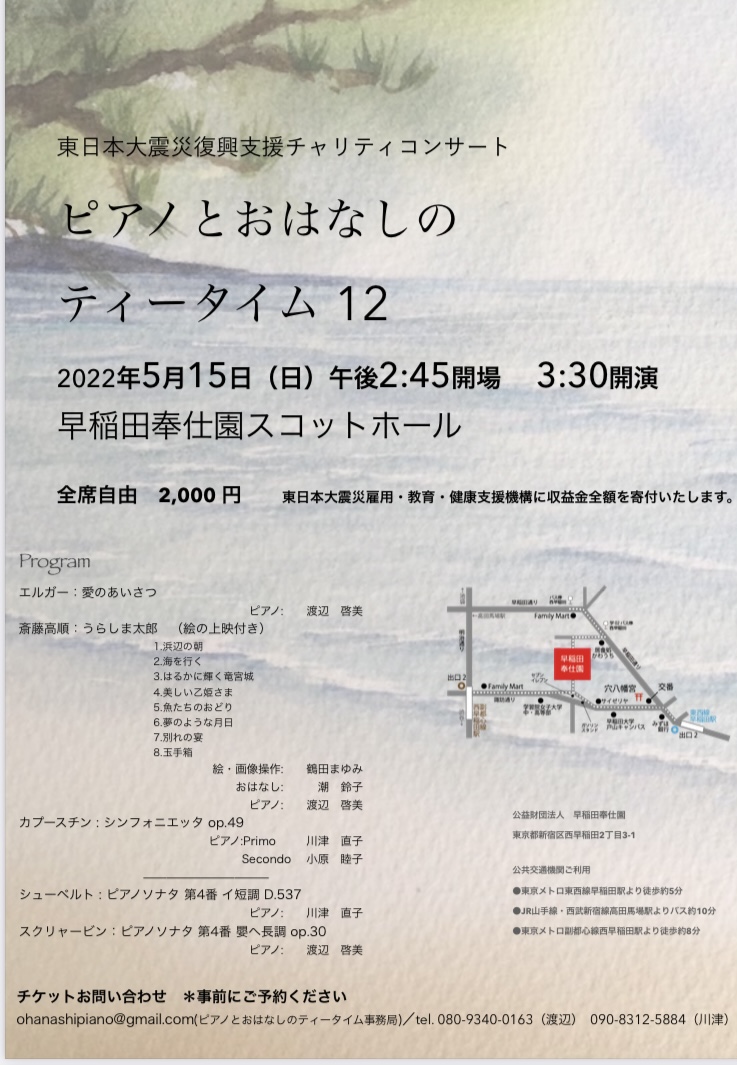 「ピアノとおはなしのティータイム12」東日本大震災復興支援チャリティコンサートが、3年ぶりに5月15日(日)に早稲田奉仕園スコットホールで開催されます。