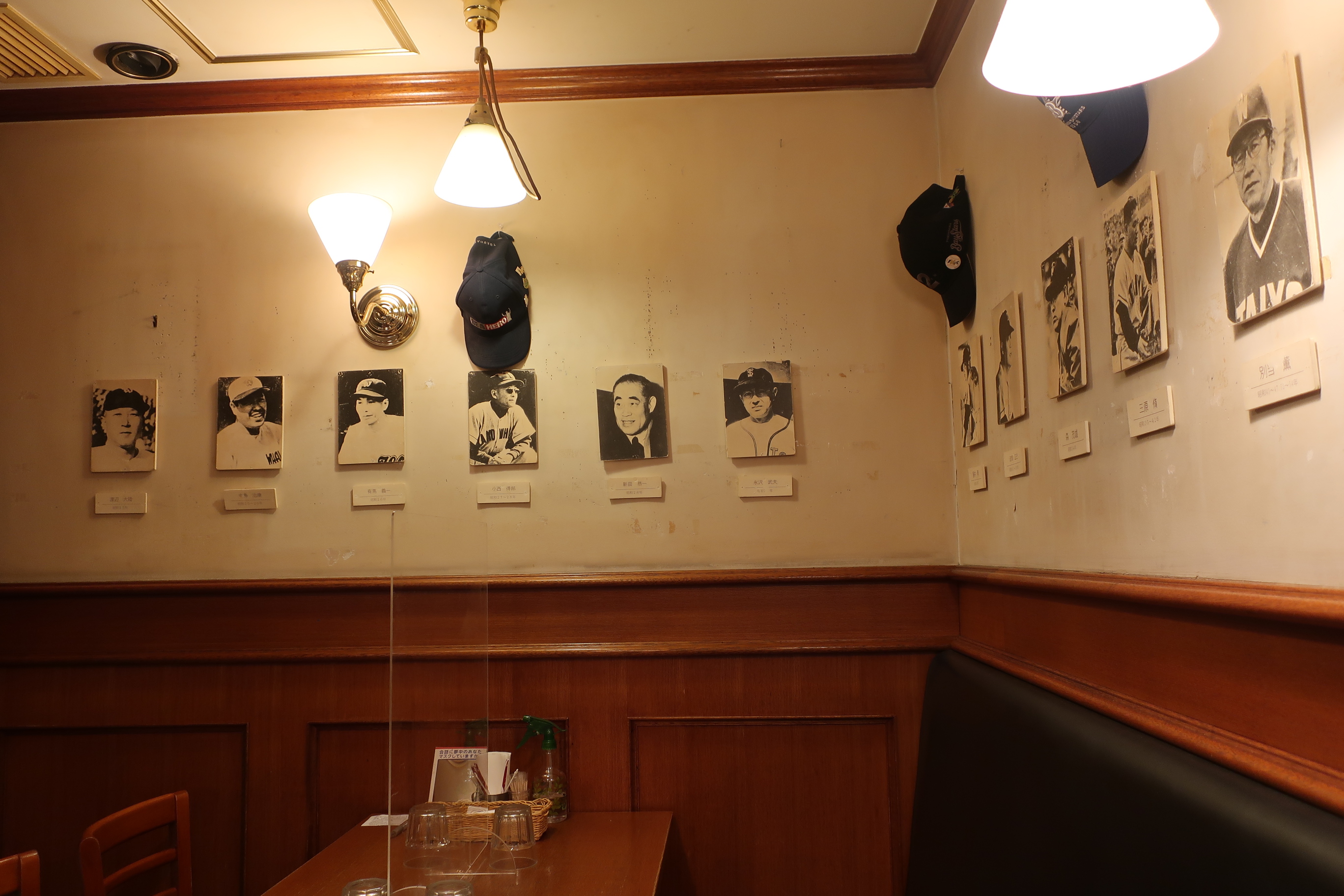 【客席の壁には大洋ホエ-ルズ時代を含む歴代の監督写真】