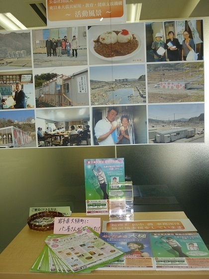 震災機構横浜本部の玄関に設置されている大槌町での活動風景の写真や震災機構の各種チラシ、大槌町への募金箱です。