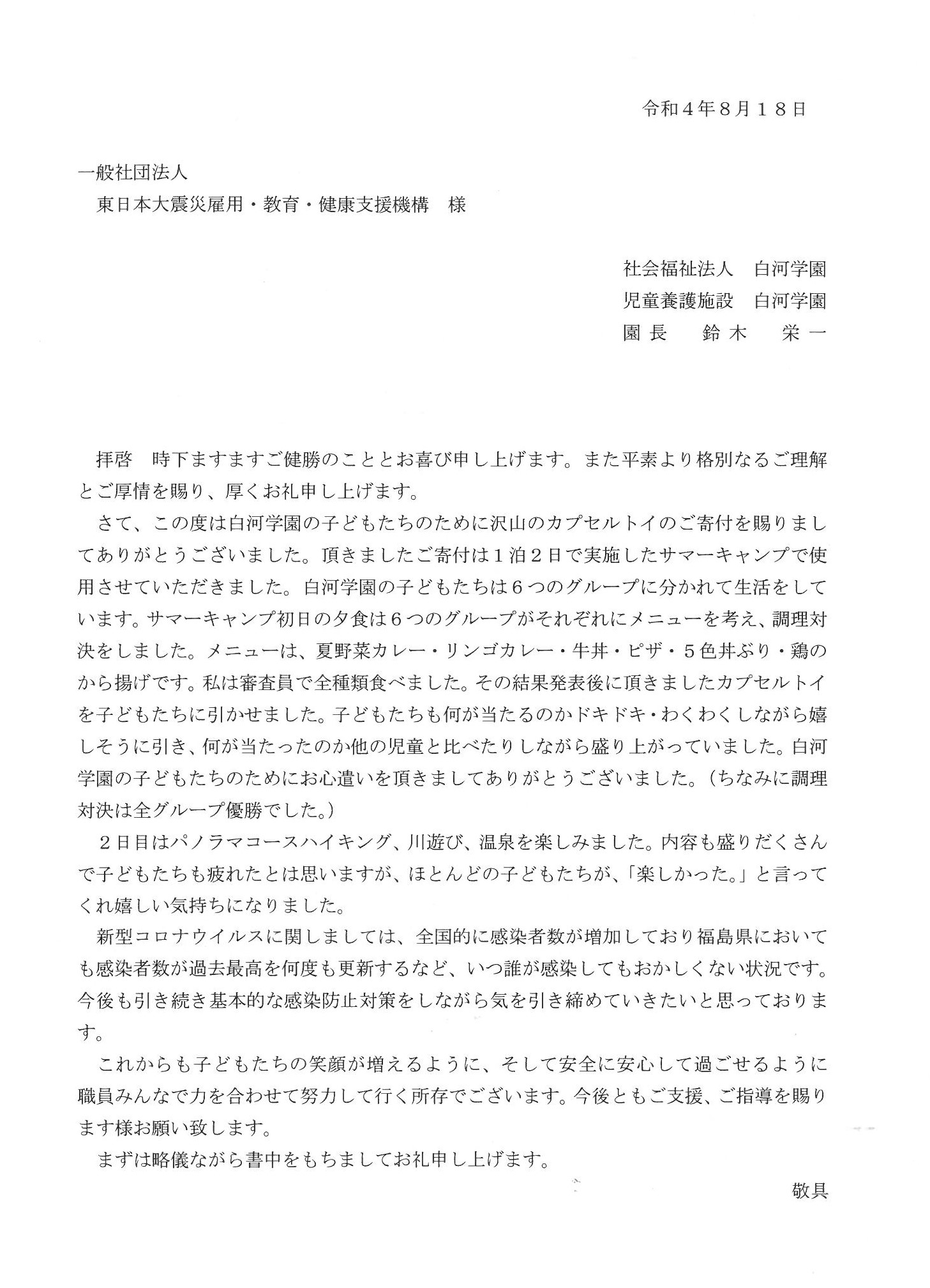 このたび福島県白河市の社会福祉法人 白河学園様、児童養護施設 白河学園様から、サマーキャンプでカプセルトイをご活用していただいたとのお礼状が届きました。
