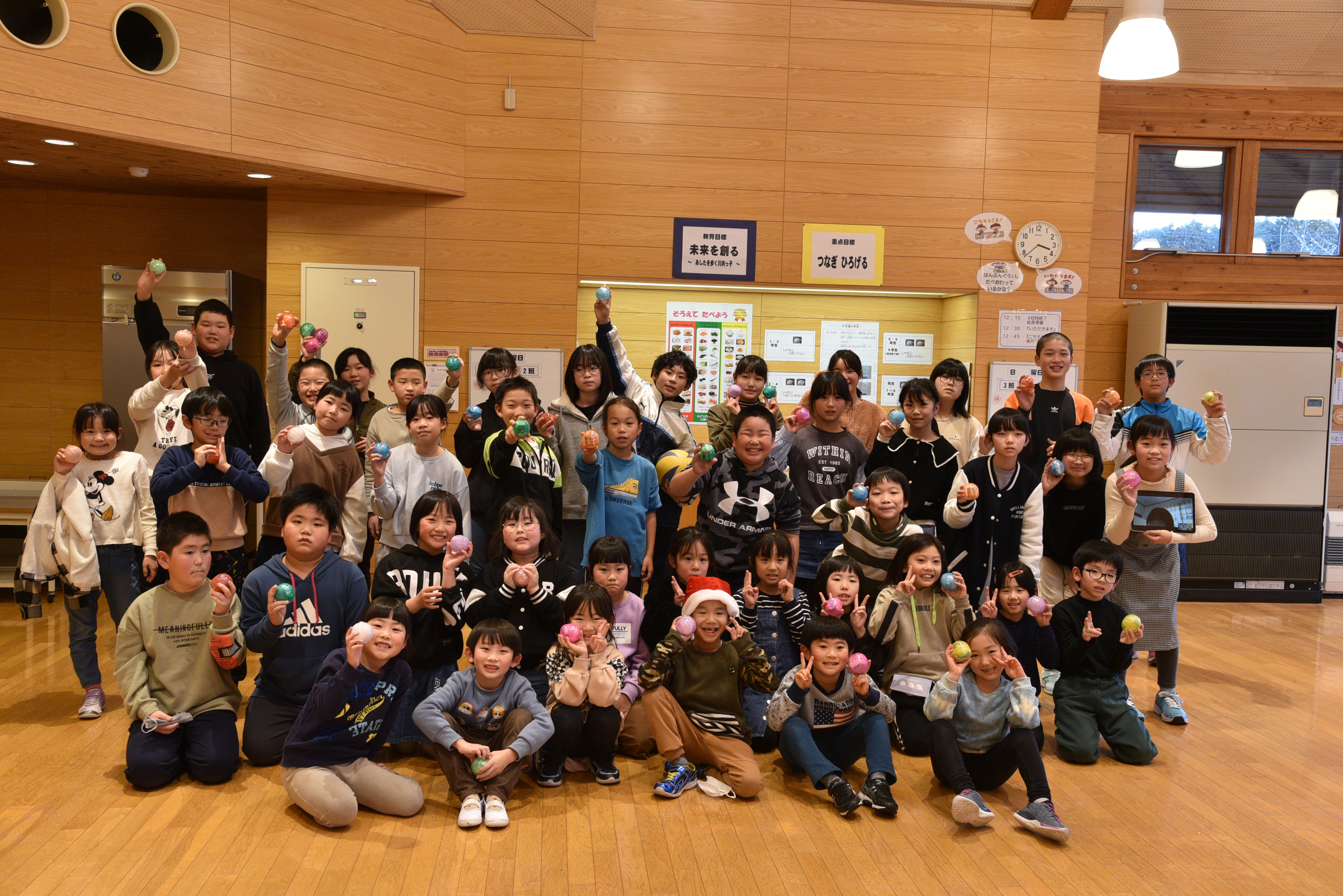 このたび 福島県双葉郡の川内村立川内村立川内小中学園様から、12月お楽しみ集会にて子どもたちに配布した時の写真が届きました。