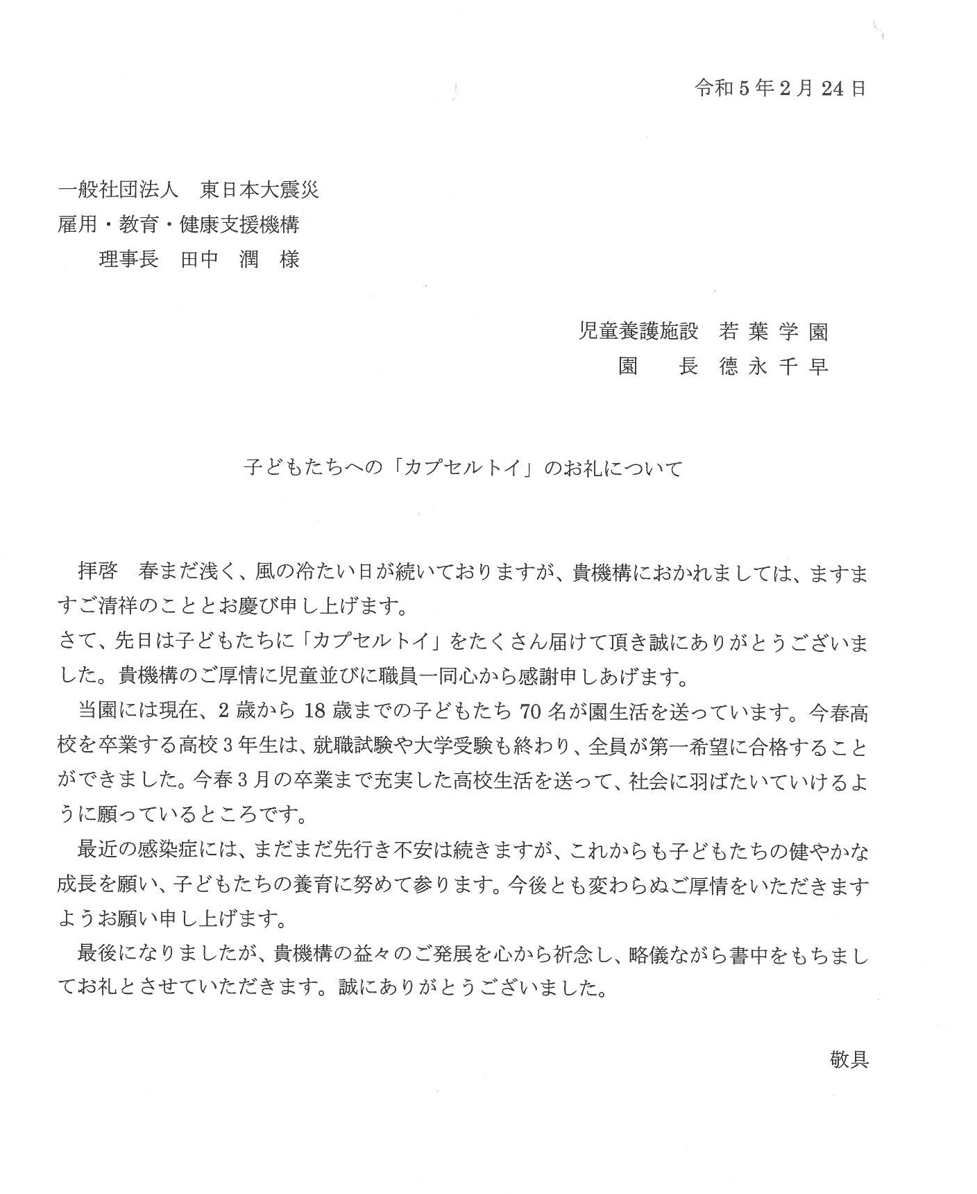 このたび鹿児島県姶良(あいら)市の児童養護施設 若葉学園様から、お礼状が届きました。