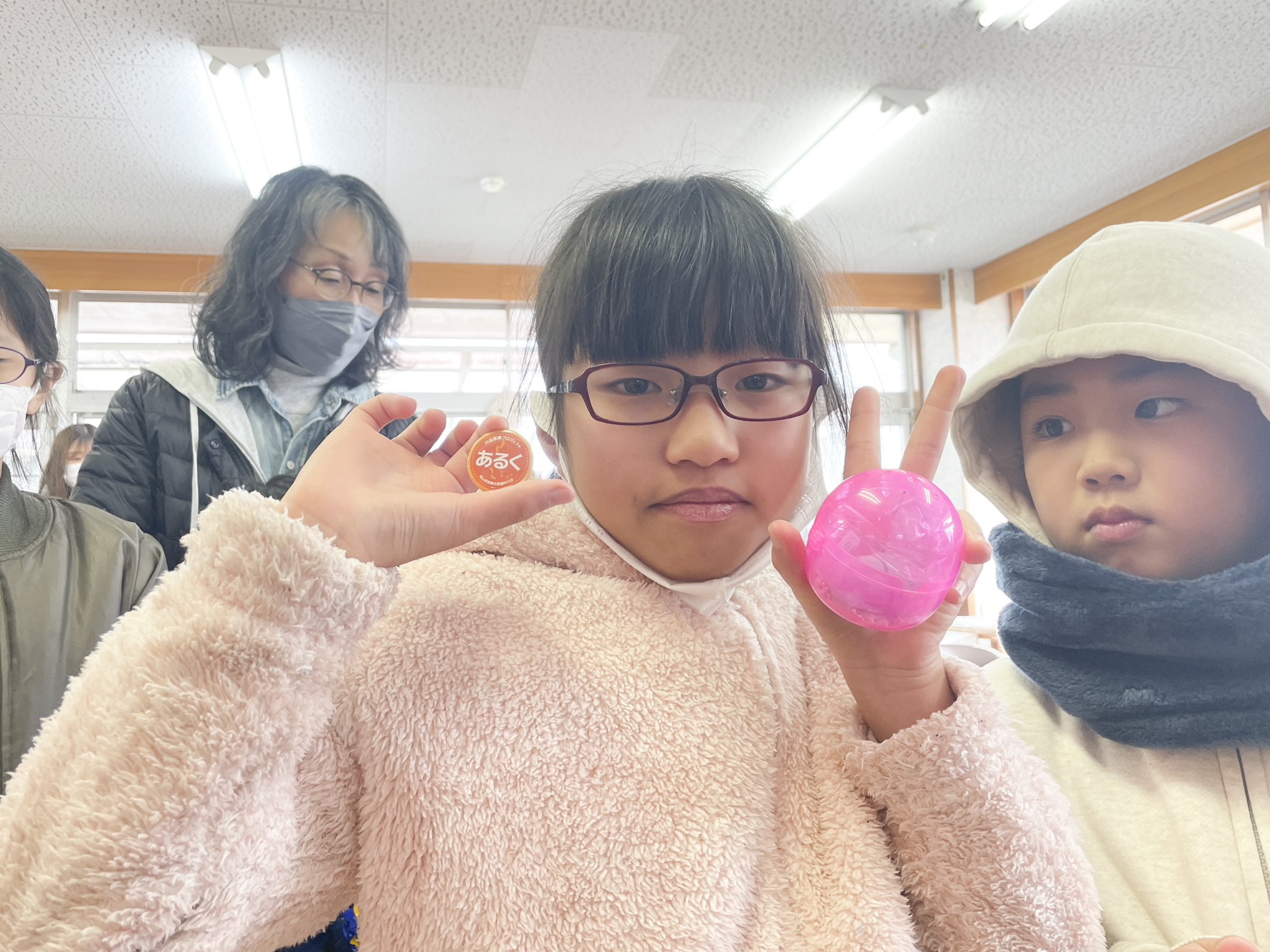 幣機構が、平成30年の西日本豪雨災害の復興支援をこれまで行ってきた岡山県倉敷市真備町あるく様の 放課後デイサービス「ホハル」様から、カプセルトイ配布時の写真が届きました。