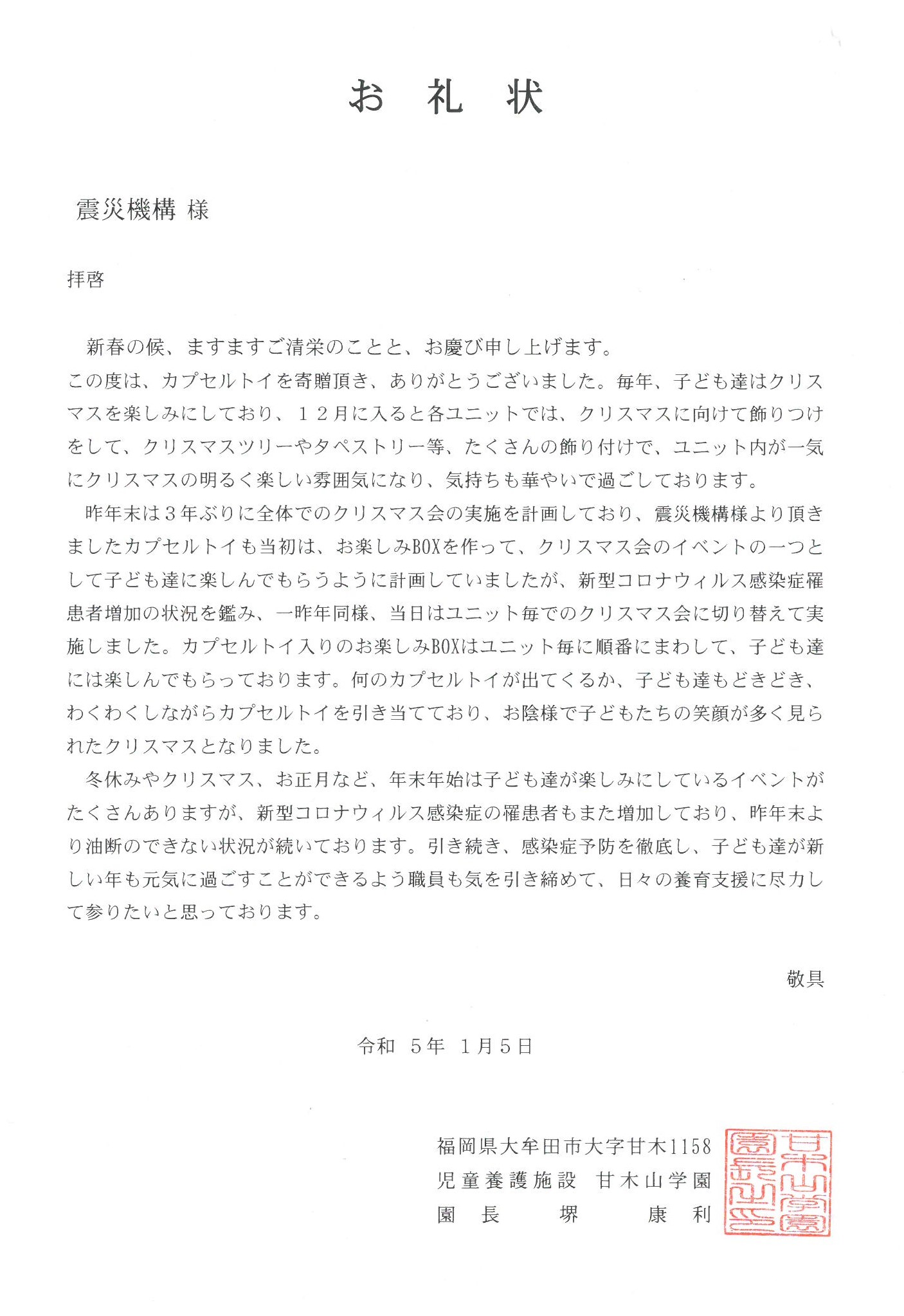 このたび福岡県大牟田市の児童養護施設 甘木山学園様お礼状と写真が届きました。