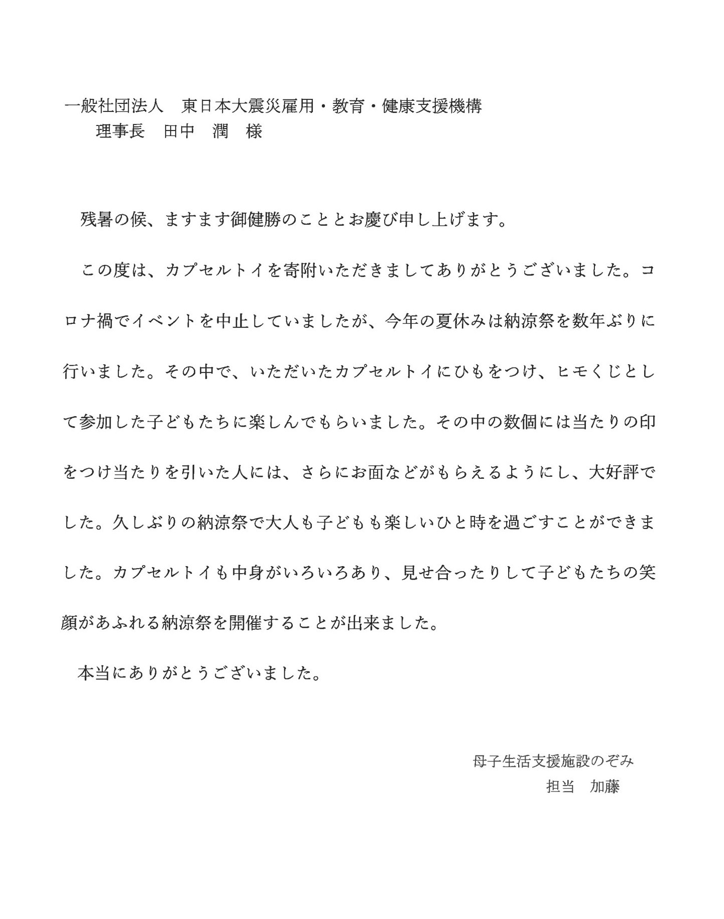 このたび、鳥取県八頭(やず)町の母子生活支援施設のぞみ様から、お礼状と納涼祭の写真が届きました。
