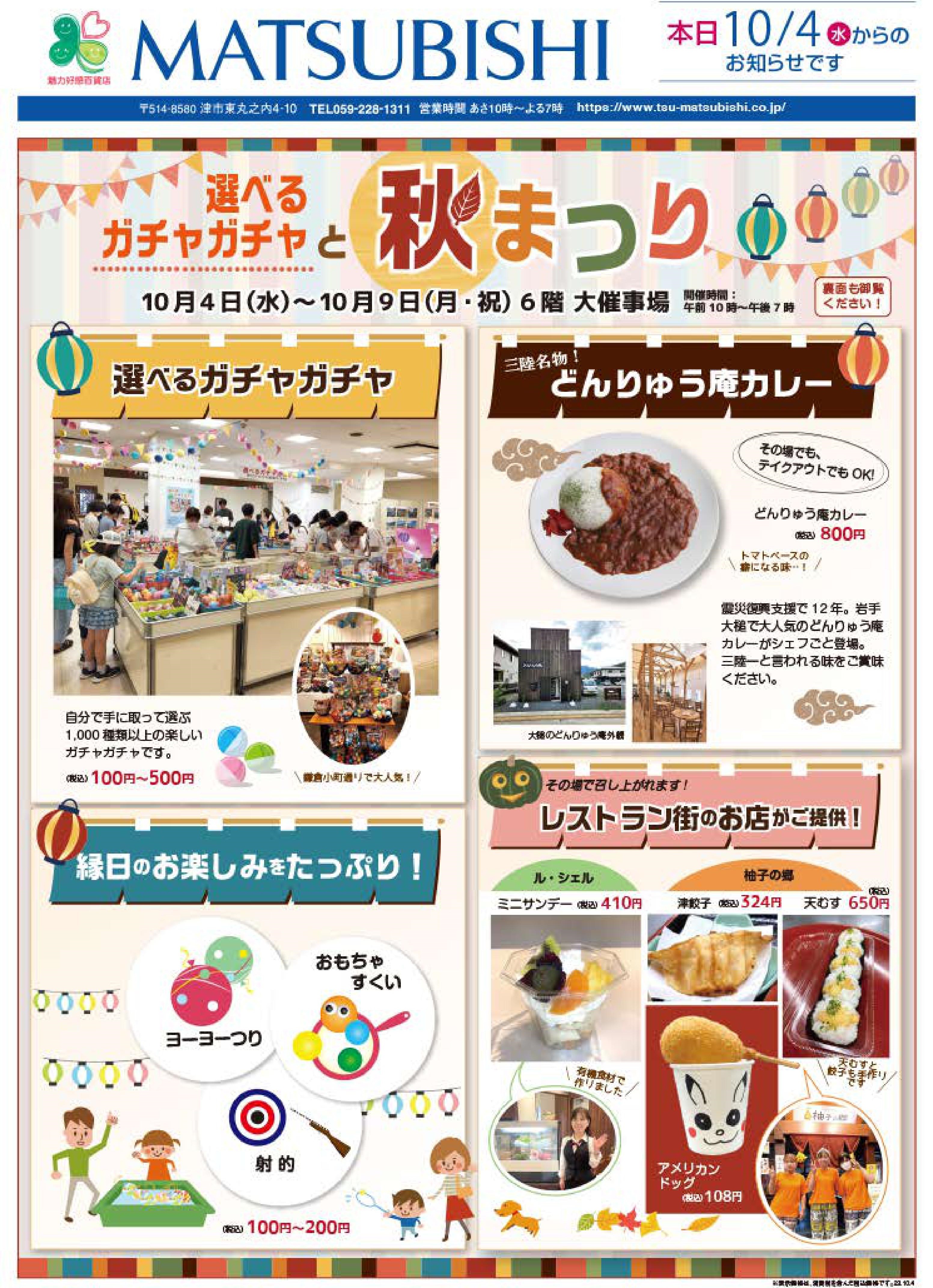 震災機構は、三重県津市の松菱百貨店において、選べるガチャガチャ(カプセルトイ)の頒布と岩手県大槌どんりゅう庵のカレーの提供による復興啓発イベント「選べるガチャガチャと秋祭り」を開催しています。
