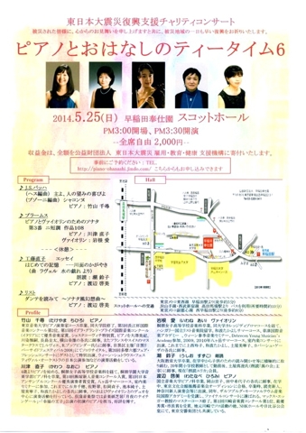 「ピアノとおはなしのティータイム6」東日本大震災復興支援チャリティコンサートが5月25日(日)に早稲田奉仕園スコットホールで開催されます。このコンサートの収益を全額、当機構にご寄付いただくことになりました。
