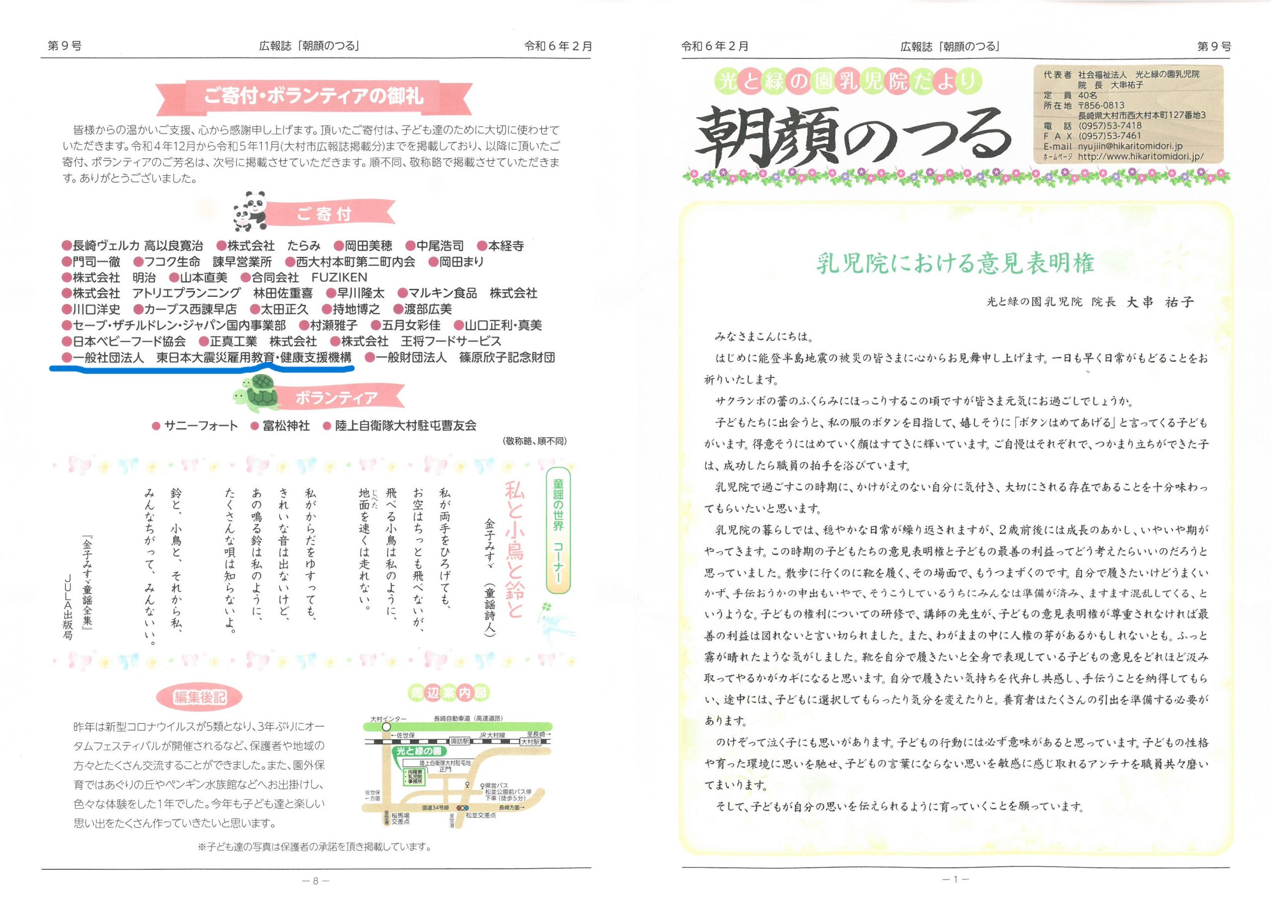 このたび、長崎県大村市 社会福祉法人 光と緑の園様から広報誌「朝顔のつる」第9号(令和6年2月)が届きました。 ご寄付欄に震災機構を記載してくださり、ありがとうございます。